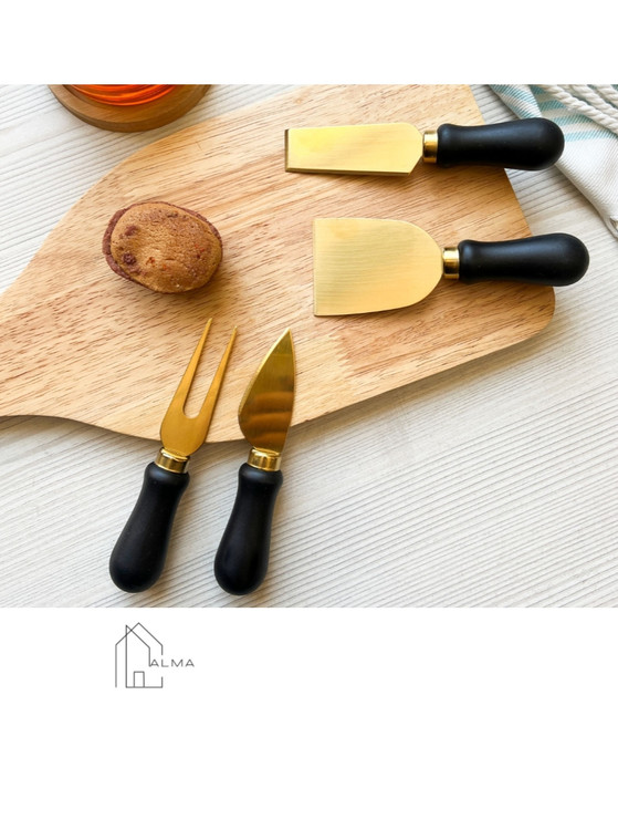 ست کارد صبحانه خوری ، یک سرویس کوچک چهار پارچه زیبا با طراحی چشم نواز است . این سرویس شامل چاقو پهن ، چاقوی پخش کننده ، چاقوی پنیر سخت و چنگال سرو بوده که تیغه آنها از استیل طلایی و دسته با کیفیت مشکی می باشد . چاقوی پهن برای برش پنیر نرم می باشد که سر آن به صورت دولبه طراحی شده و امکان استفاده به عنوان یک چنگال کوچک را نیز جهت برداشتن پنیر برش خورده و یا حتی دیگر مواد غذایی سرو شده در کنار آن را دارد . چاقوی پنیر سخت دارای لبه دو طرفه در سمت چپ و بالای خود برای برش پنیرهای نیمه سفت و نرم می باشد ، اما پس از برش نیاز به پهن کردن پنیر بر روی نان و یا سایر مواد غذایی وجود دارد که این کار نیز وظیفه چاقوی پخش کننده است و در نهایت چنگال زیبای سرو که با استفاده از آن می توانید پنیر و سایر مواد غذایی قرارگرفته در کنار آن را بردارید . ست کارد و چنگال صبحانه خوری به دلیل ابعاد و نوع طراحی خود می تواند علاوه بر زیبایی و جذابیت خاصی که به میز صبحانه شما می بخشد ، افراد خانواده را به صرف یک وعده غذایی مهم روزمره نیز ترغیب نماید . ست کارد پنیر خوری در بسته بندی چهار عددی و به صورت تک رنگ ارائه می شود و قابل ست شدن با انواع ظروف با طراحی و رنگ بندی متفاوت است که امکان شست و شو و نگهداری در کمترین فضای ممکن را نیز دارند .