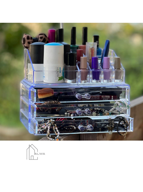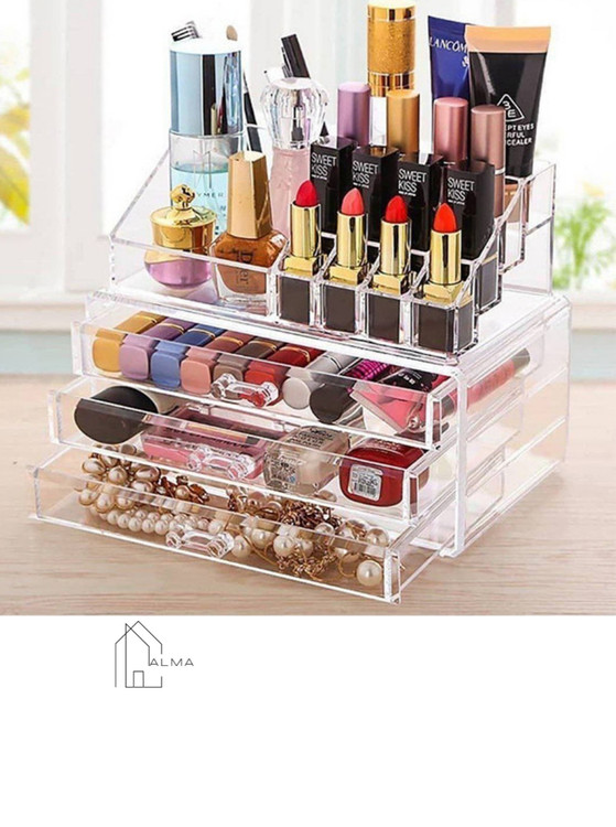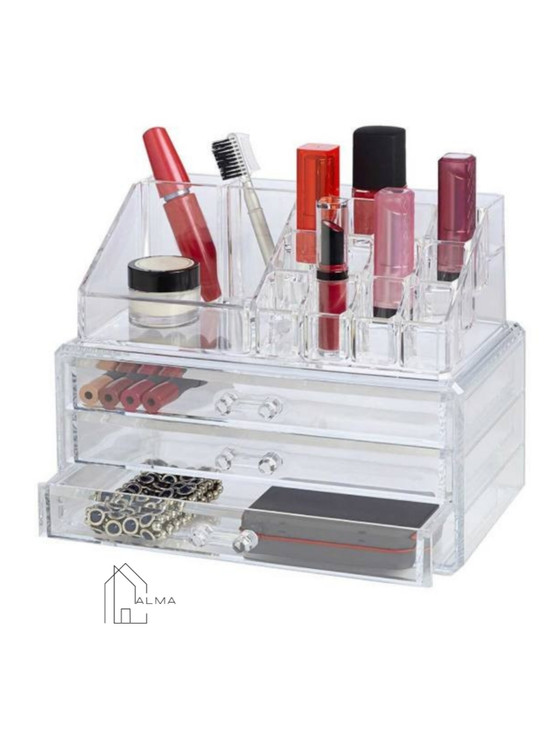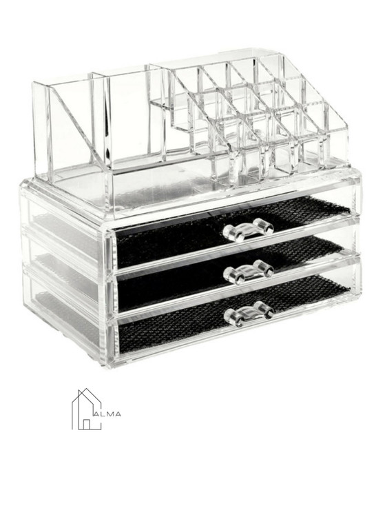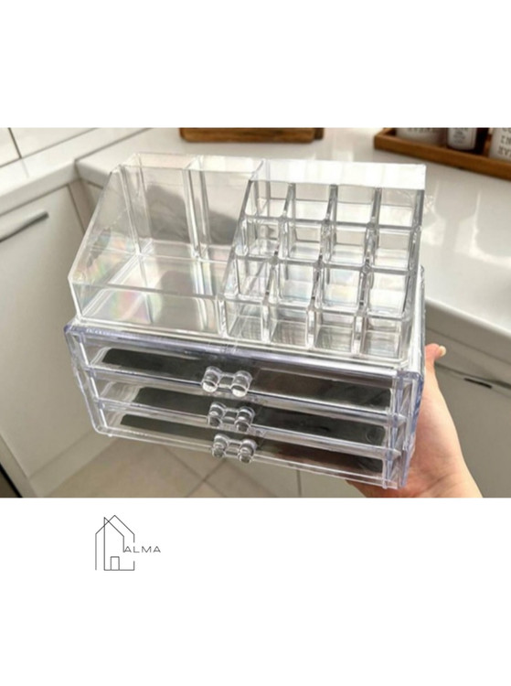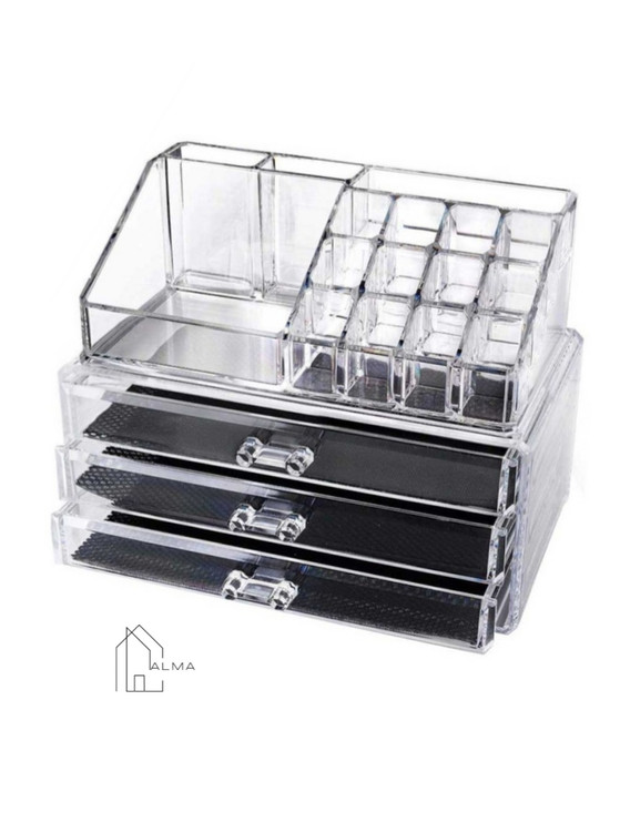 جای لوازم آرایشی محصولی با طراحی لوکس و زیبا دارای 16 محفظه شفاف جهت قرار گیری آیتم های مختلف در قسمت بالایی، دارای ابعادی به طول 25 و عرض 14 و ارتفاع 20 سانتی متر، محصول شیک و دارای طراحی منحصر به فرد است که در زیر کار دارای 3 کشو میباشد . اگر بدنبال وسیلهایی برای مرتب کردن و جمع کردن وسایل آرایشی و بهداشتی خود هستید استند لوازم آرایشی ویژن مدل سه کشو را به شما پیشنهاد می کنیم.