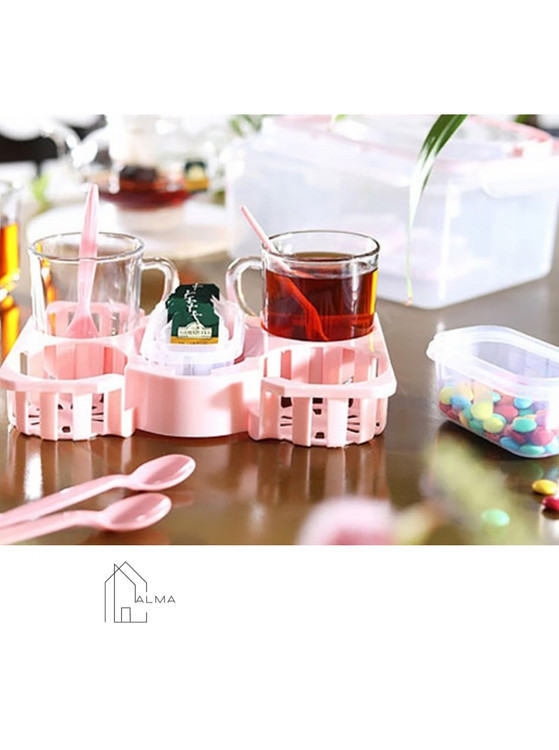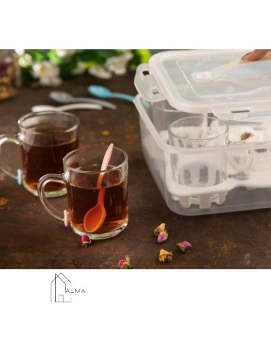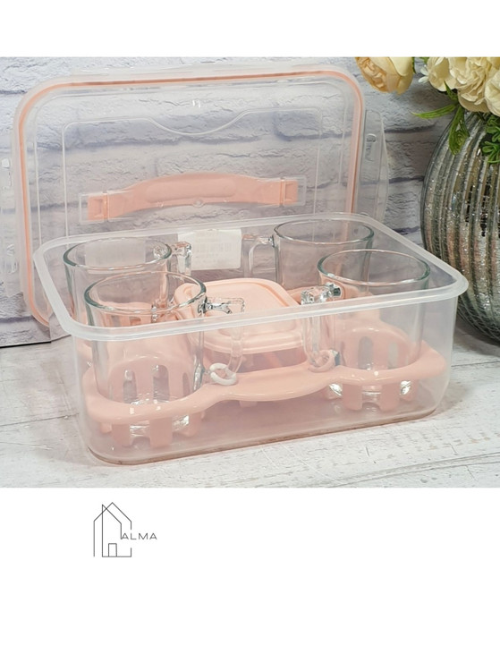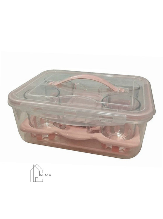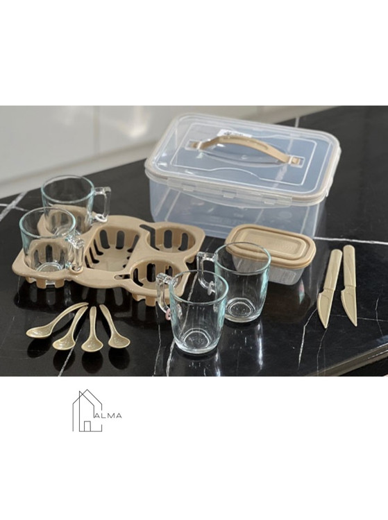 4عدد لیوان ، 2 عدد چاقو ، 4 عدد قاشق چایخوری ، 1 عدد سینی و 1 عدد ظرف کوچک