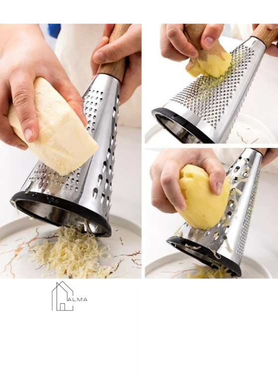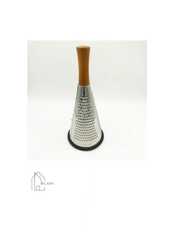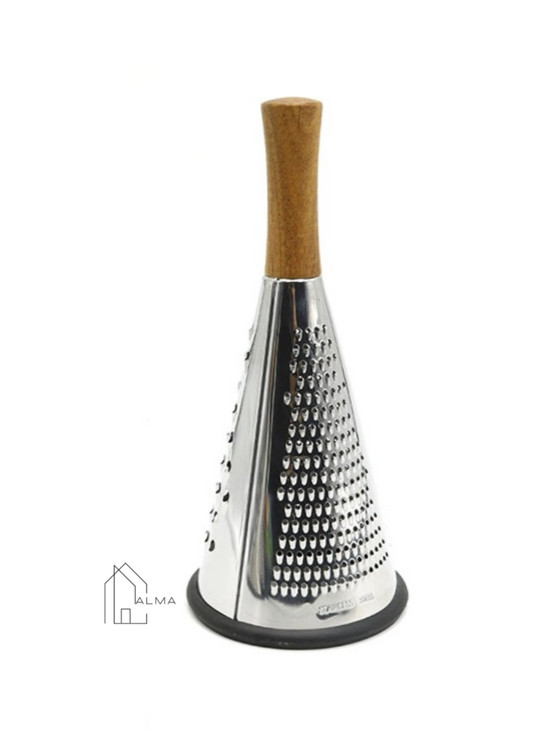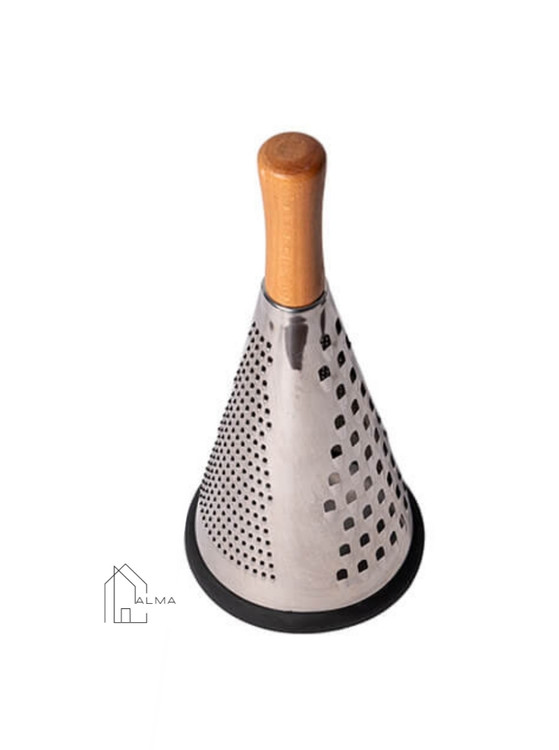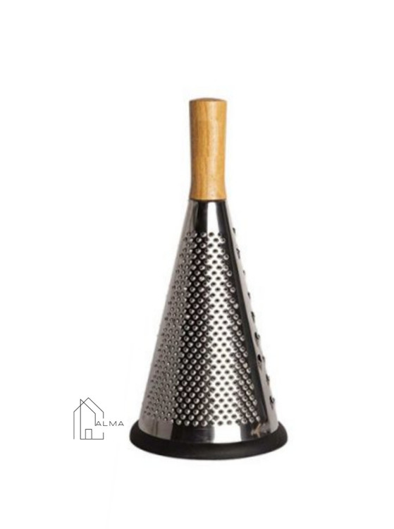 این رنده مخروطی با طراحی ارگونومیک بسیار راحت در دست قرار میگیرد و از خستگی دست جلوگیری می کند. سبک و درعینحال مقاوم است و به صورت دوتکه، شامل تیغه هرمی شکل استیل ضد زنگ، دارای سه سایز مختلف رنده ریز، متوسط و درشت و دسته چوبی بامبو ضد آب که به صورت پیچی به قسمت تیغه متصل گردیده، تولید شده است که ارتفاع آن حدود ۳۰ سانتی متر است. قطر قسمت پایین رنده ۱۳ سانتی متر است و فضای کافی برای ورود دست را به شما می دهد که شستشوی داخل رنده را بسیار راحت میکند. نوار سیلیکونی تعبیهشده در قسمت پایین رنده در زمان استفاده از سرخوردن و ایجاد خط و خش بر ظروف و سطوح جلوگیری مینماید.